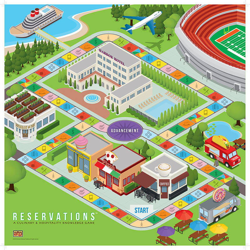 - Reservations: A Culinary & Hospitality Knowledge Game addresses key concepts in culinary arts, restaurant management, and hospitality curriculums. Along the game path, players/teams can land on one of the six proficiency spaces to respond to a question about Nutrition & Food Chemistry, Menu Terminology, Cost Control, Sanitation & Safety, Food & Beverage Preparation, and Hospitality & Lodging. In addition, players/teams can also land on a space to respond to a question about Flavor Builders, Tally It Up (math), and Food History.